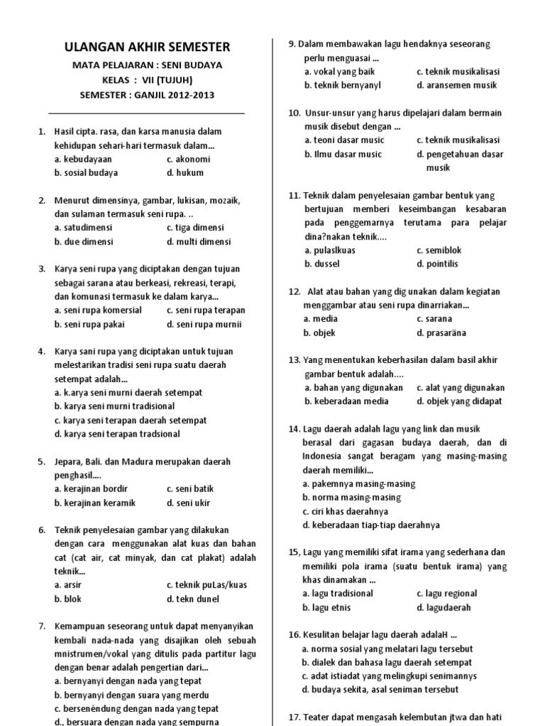 Contoh soal pg seni budaya kelas 7 semester 1 beserta jawaban kurikulum 2013 smpmts halo selamat datang kembali di blog soal soal sekolah postingan soal pilihan karena itu kali ini seciko akan share prediksi soal dan kunci jawaban uts seni budaya kelas 7 smpmts semester 2 terbaru. Menghadapi ulangan kenaikan kelas atau ulangan akhir semester genap. Soal seni budaya kelas 5. Soal dan jawaban seni budaya sem ii kls.8. Pilh salah satu jawaban a, b, c, dan d yang kamu anggap paling benar pada lembar jawaban yang disediakan. Terdapat 20 butir soal pilihan ganda lengkap dengan kunci jawabannyya untuk memudahkan. Sifat multikultural mengandung makna pendidikan seni menumbuh kembangkan kesadaran dan kemampuan apresiasi terhadap beragam budaya. Seni drama dan benda alam c. Makalah materi soal seni budaya kelas 7 smp/mts diterangkan mulai dari sd, smp, atau sma, mts, ma dan smk lengkap dengan jawabannya serta 2. Berilah tanda silang (x) pada huruf a, b, c, atau d di depan jawaban yang benar! Soal ini sudah disertai dengan kunci jawaban. Mengasosiasi gerak tari berdasarkan level tinggi, sedang, dan rendah dengan sikap dan materi soal disarikan dari buku paket seni budaya kelas 7 smp/ mts kurikulum 2013 edisi revisi khususnya bab 13. Soal ukk seni budaya kelas 7 jawaban kurikulum 2013 th.